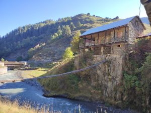 Our guided enduro motorcycle tour heads towards Omalo, passing through the green meadows of the Caucasus and the crystal-clear Sioni Lake in the Alazani Valley. For millennia, this fertile region has been producing wine exported worldwide. We then ride on Georgia’s highest and narrowest gravel road, winding through beautiful, untouched Caucasus mountain landscapes, to the Abano Pass at an impressive 2,926 meters above sea level. The route is very winding with numerous ascents and descents and refreshing water crossings. At the end of this adventurous enduro trail through the so-called roller coaster of Tusheti, we reach the day’s highlight, the traditional village of Omalo. It is famous for its distinctive and well-preserved 12th-century watchtowers guarding the heart of the Caucasus.